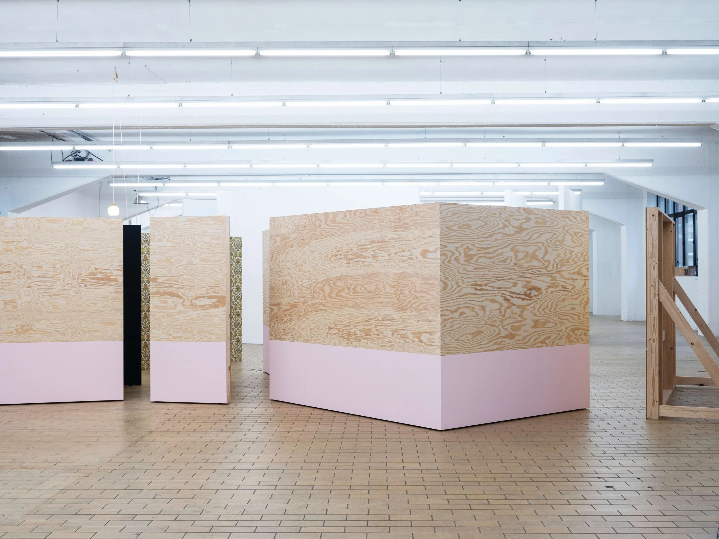 Mobile Installation with 7 walls of 182 cm high, variable dimensions. 2021. Pine triplay, MDF, pine wood, felt, copper sheets, copper pipes, acrylic paint on paper, wallpaper, glass lamp, black brick, black paint mixed with charcoal, sandpaper, human hair and tricycle handlebar.